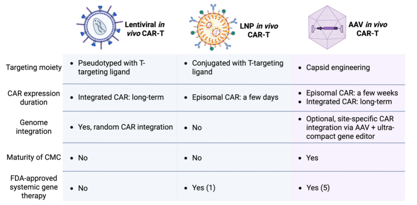 与之相比,体内(in vivo)CAR-T技术被视为下一代细胞治疗的“圣杯”。它利用病毒或非病毒载体将CAR基因直接递送至患者体内的T细胞,省去了体外制备环节,使CAR-T疗法变为一种立等可取的“注射药物”,将极大降低治疗门槛和成本。